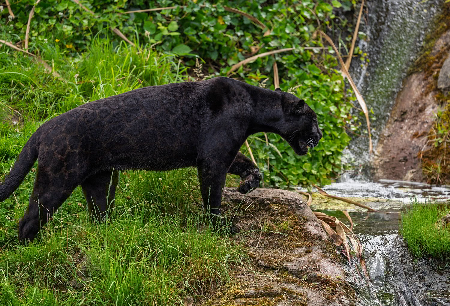 The melanistic or 'black' jaguar is a colour variant of the jaguar (Panthera onca). It appears almost entirely black due to dense pigmentation but still shows the characteristic rosette pattern in certain lights.