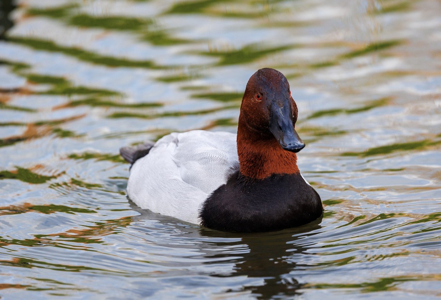 The Canvasback is a diving duck known for its striking red eyes and sloping profile. It is commonly found in North American wetlands.