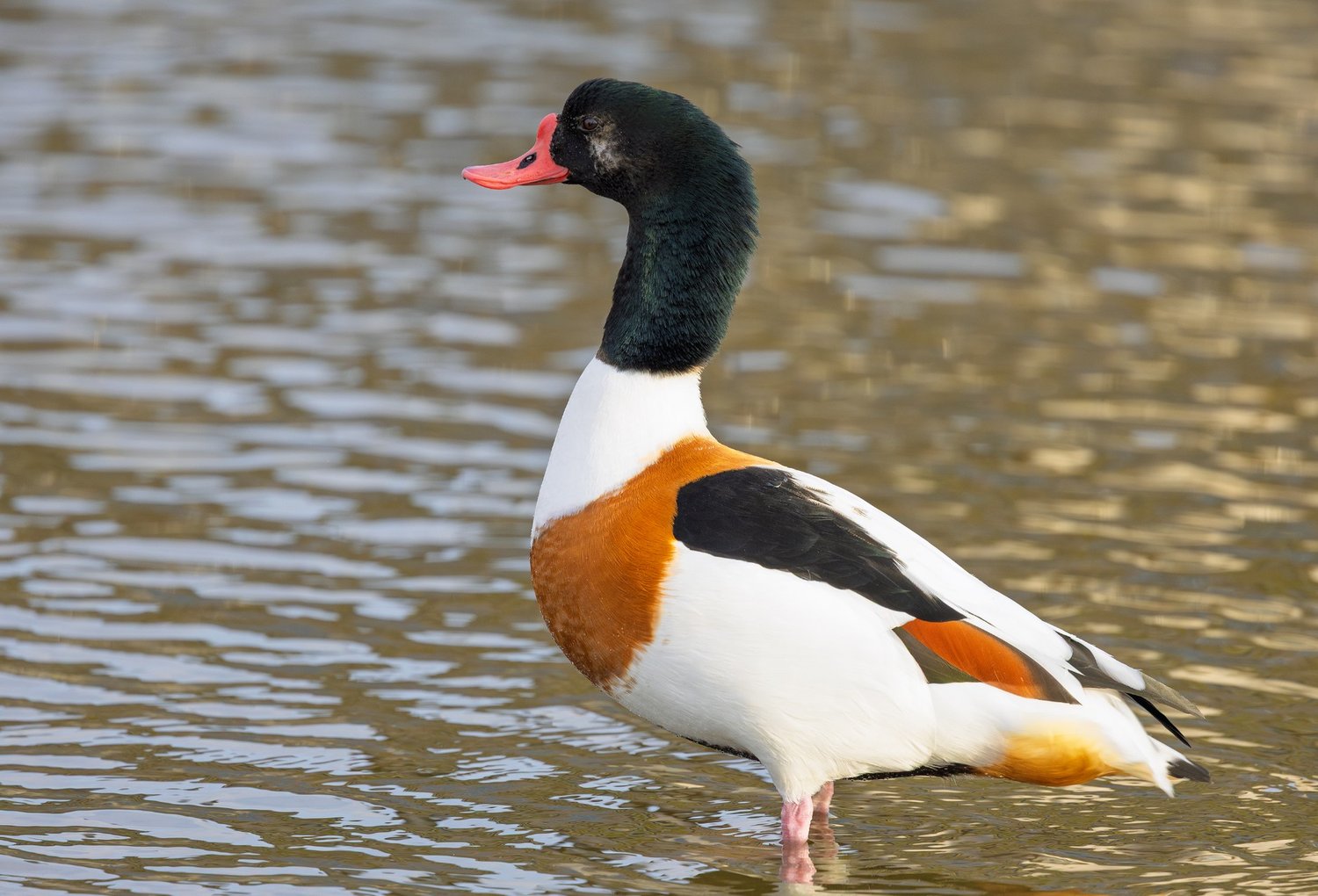 The Common Shelduck (Tadorna tadorna) is a striking waterfowl of coastal estuaries and inland lagoons. Males show a chestnut breast band and glossy head markings while females are paler and slightly smaller. They feed by dabbling and sifting for invertebrates in muddy shores and shallow waters.