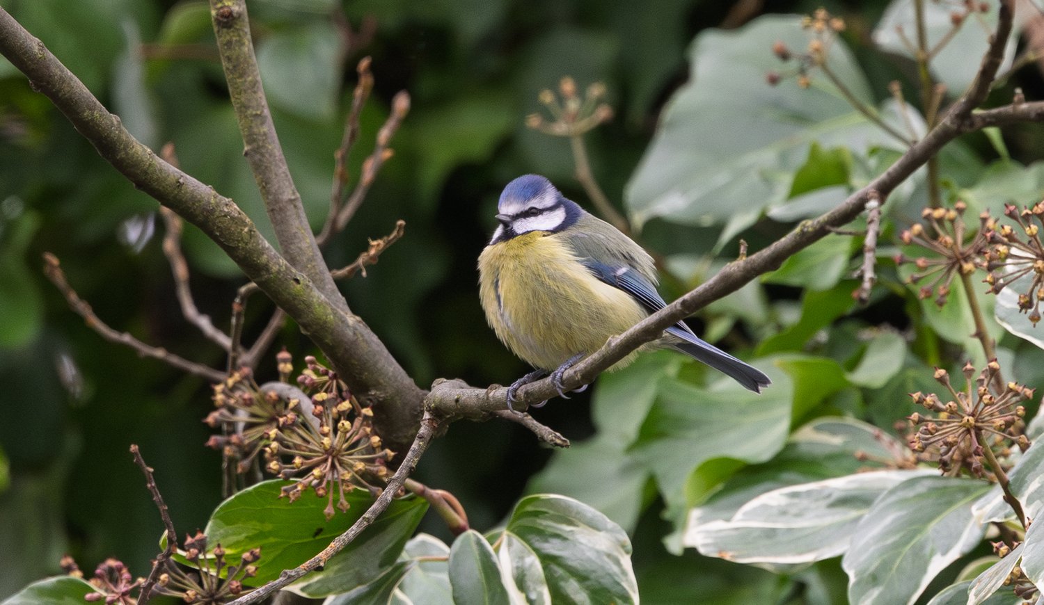 Blue tits can hang upside down on thin twigs to access insects and will readily visit garden feeders for peanuts and suet.