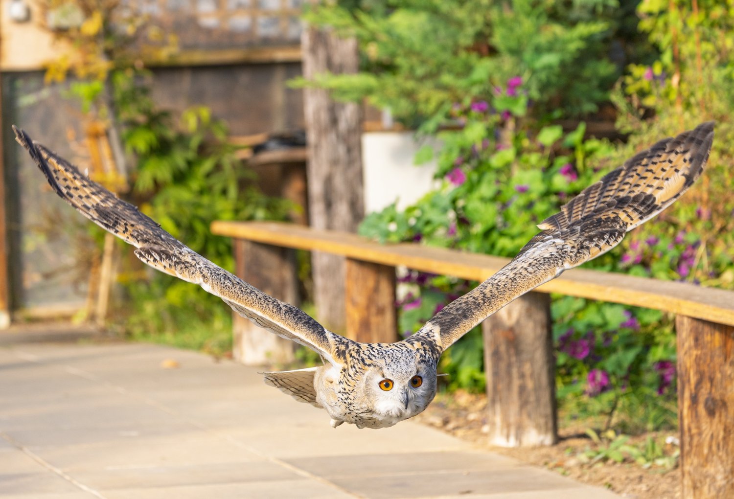 A large nocturnal owl with striking orange eyes and powerful talons, often found in woodlands and taiga across parts of Eurasia.